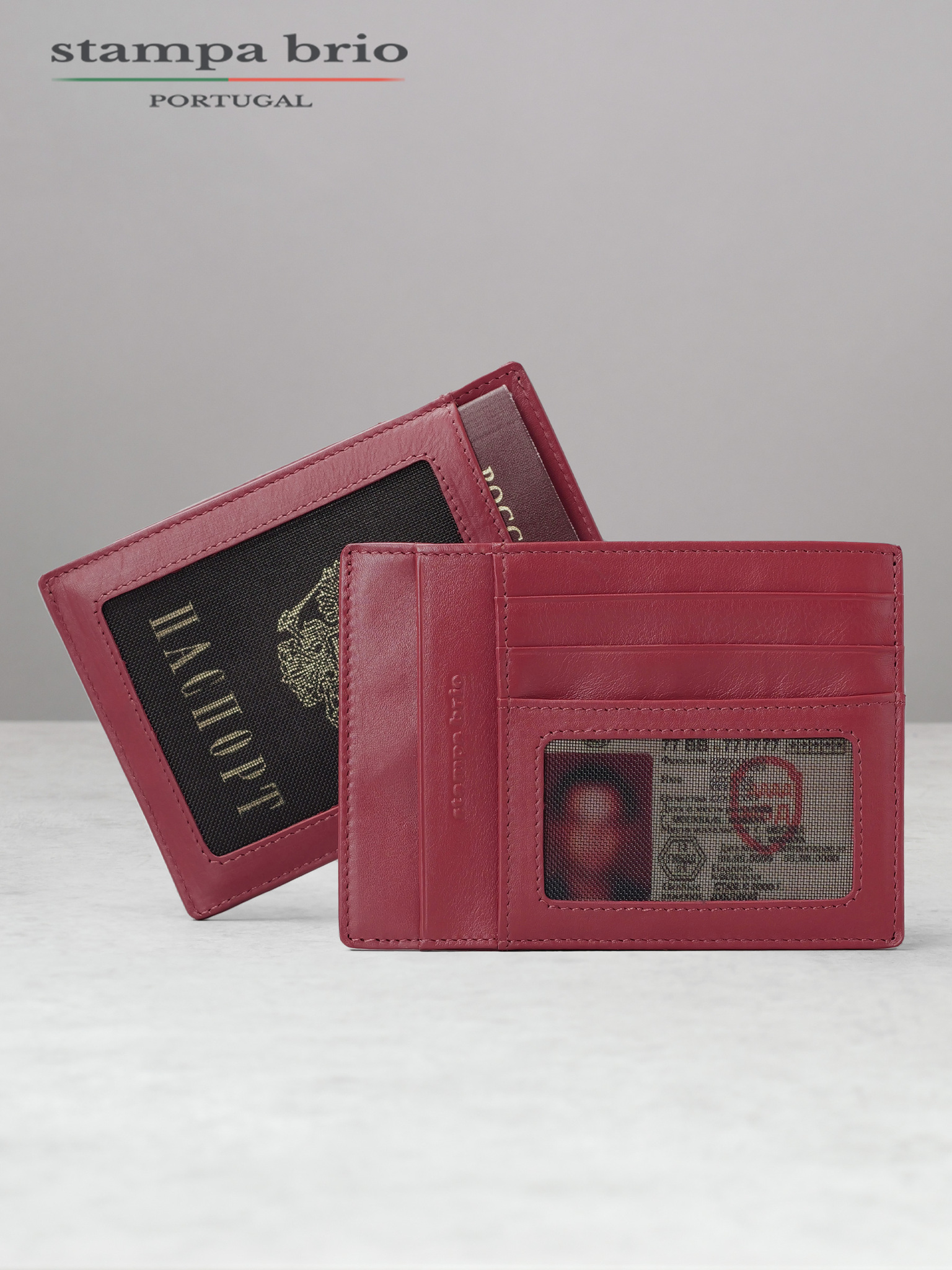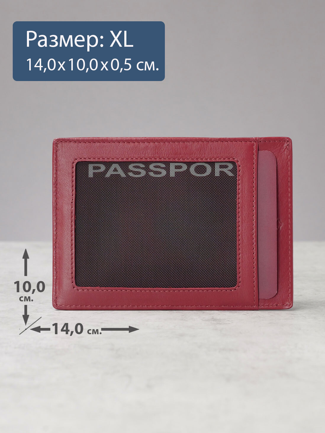 Обложка для документов. Выполнена из натуральной мягкой, гладкой кожи Наппа красного цвета. Подкладка - жаккард. Снаружи предусмотрено 3 кармана для карт, 1 прозрачный карман-окно, 2 боковых кармана разной глубины. По центру один большой карман, предполагающий хранение паспорта.