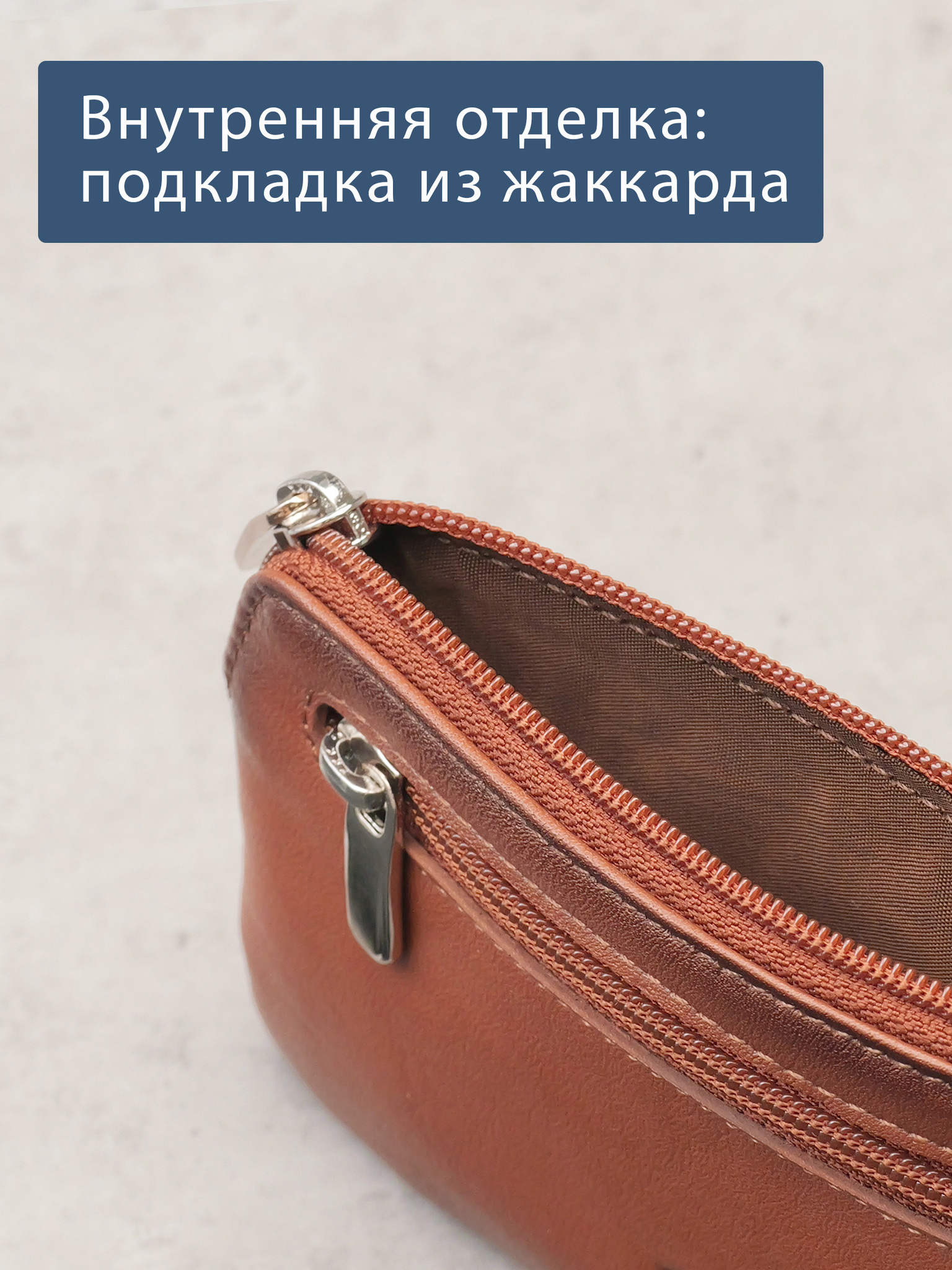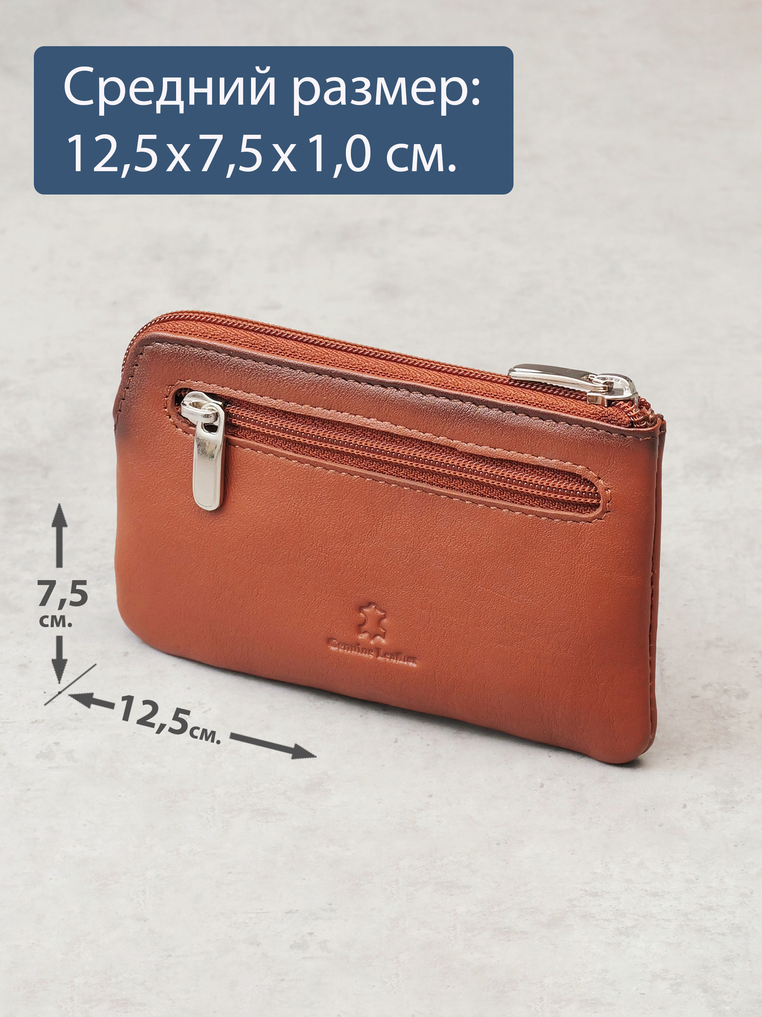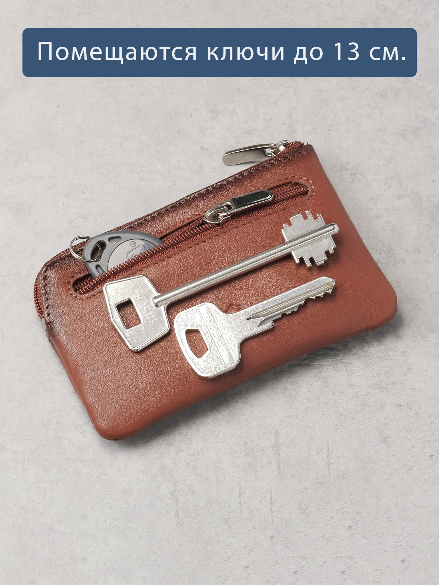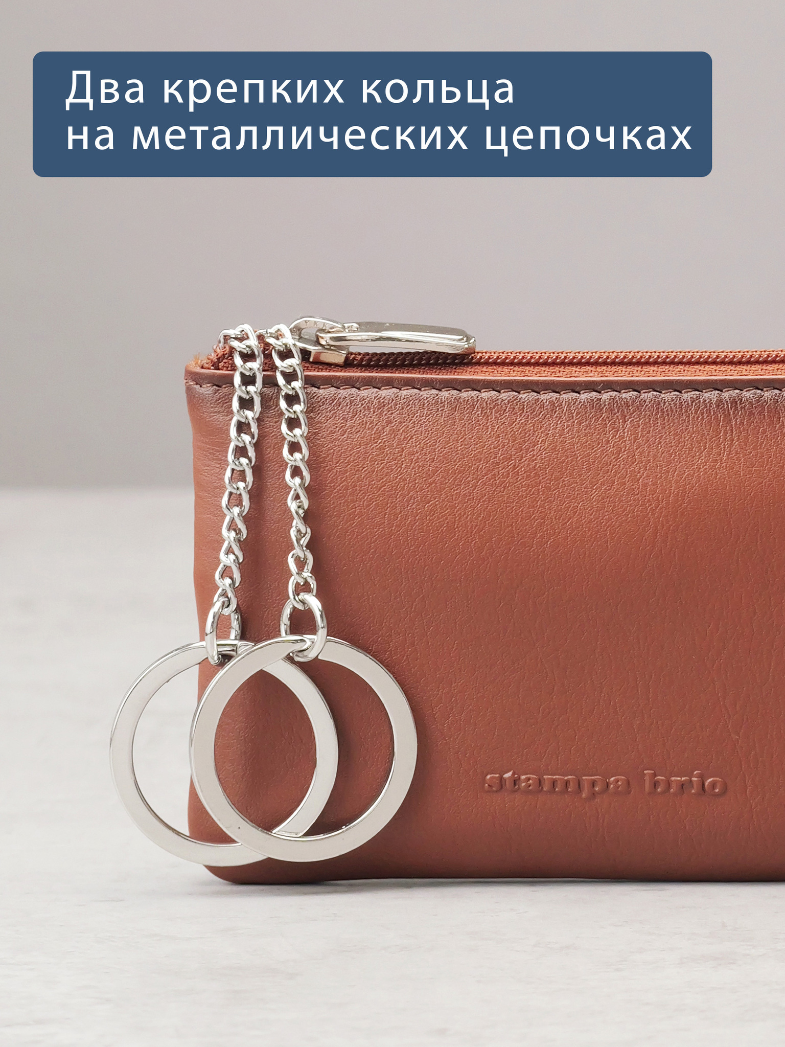 Ключница бренда Stampa Brio изготовлена в Португалии. Выполнена из натуральной мягкой кожи светло-коричневого цвета с декоративным затемнением краев. Строчка соответствует цвету кожи. Внутренняя подкладка сделана из жаккарда. Изделие предназначено для хранения различных видов ключей, включая ригельные длиной до 12,5 см. Дополнительно можно разместить автомобильные ключи с брелоком сигнализации благодаря продуманному размеру модели. Для удобства внутри есть два кольца на цепочке. Внешний карман на молнии идеально подходит для хранения карточек – от банковских до транспортных и электронных пропусков. Молнии производства японской компании YKK обеспечивают надежность использования аксессуара.
