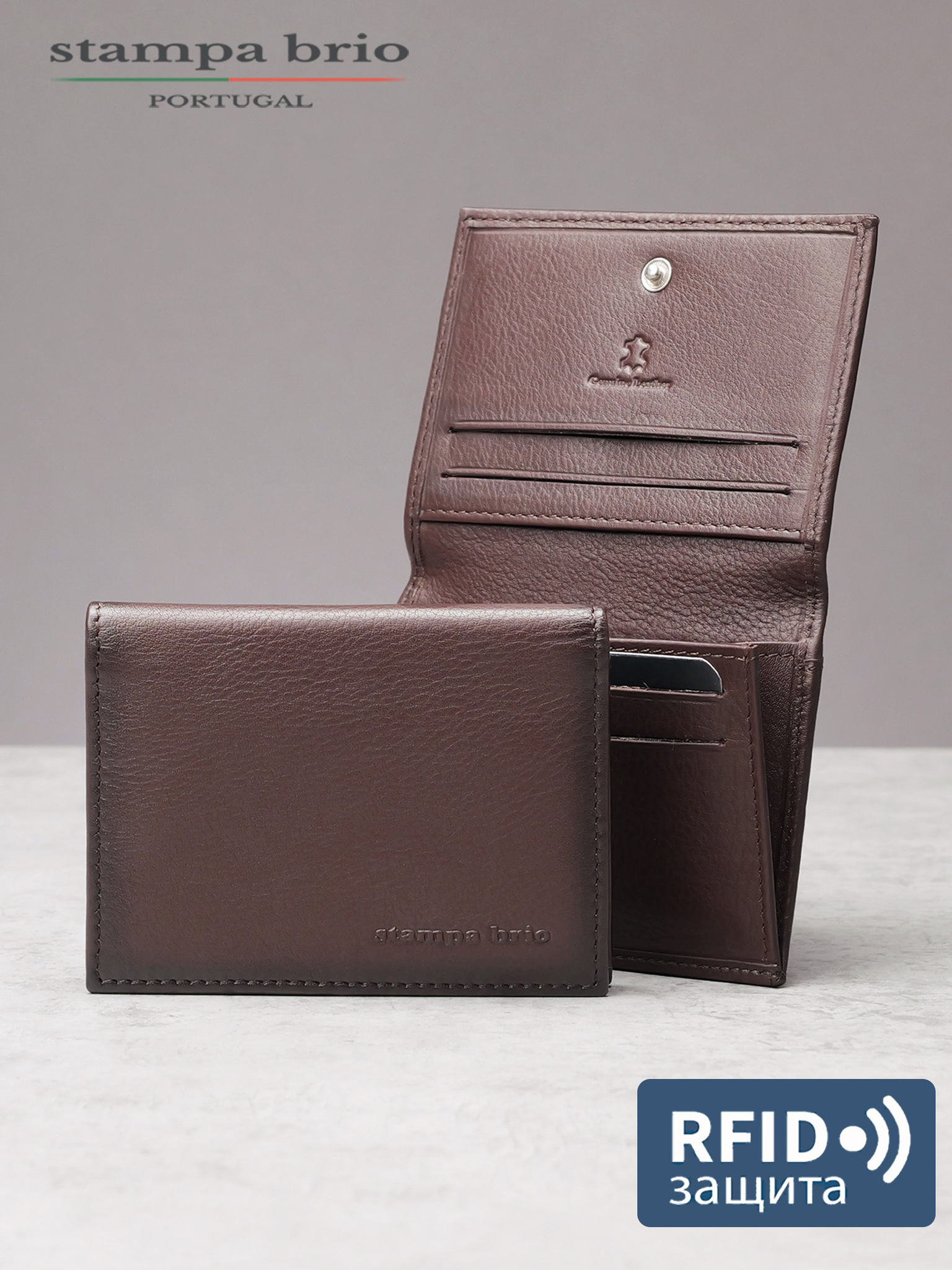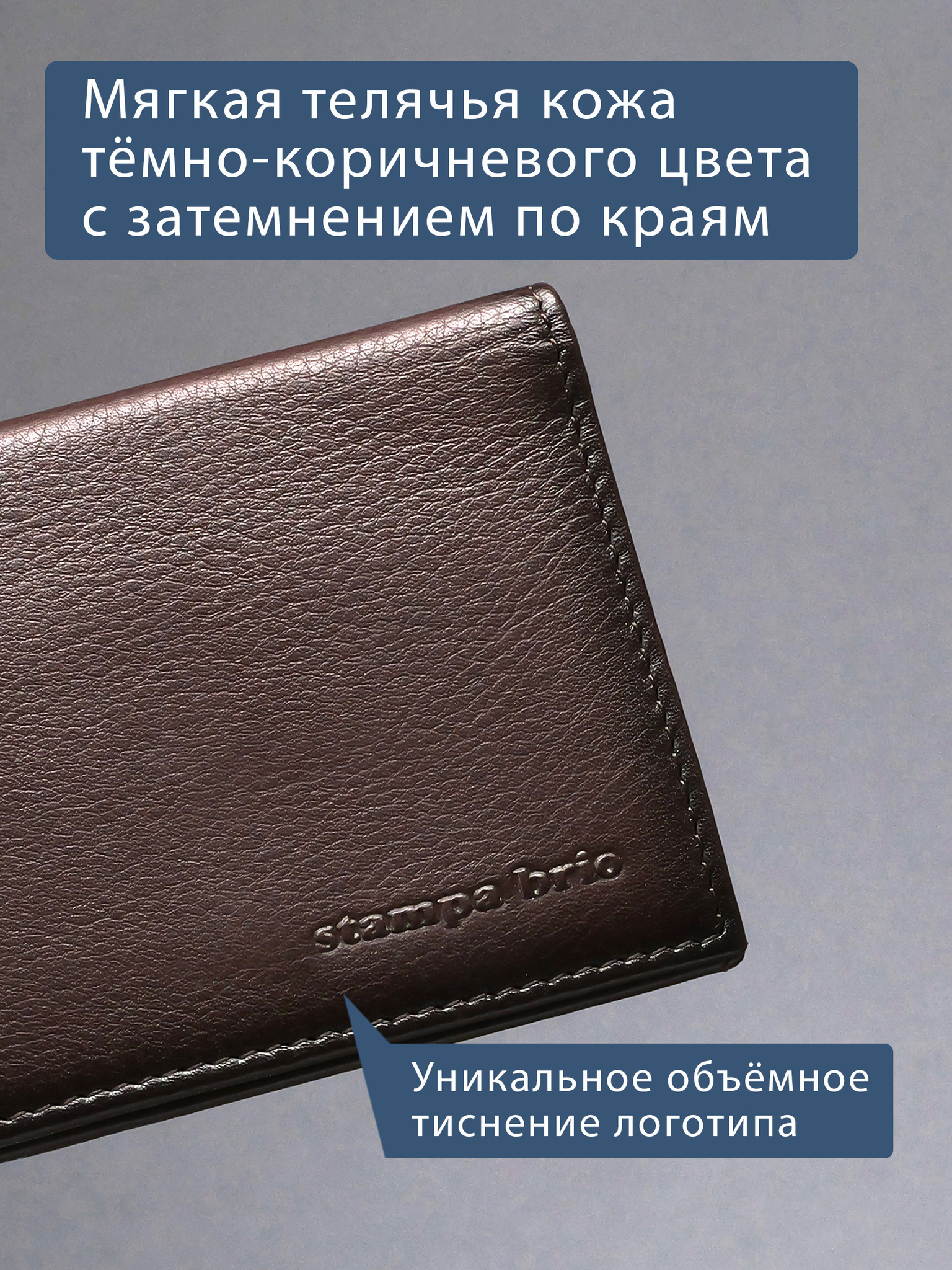 Подойдет для хранения банковских и дисконтных карт, а также собственных визиток. Можно использовать как небольшой кошелёк. Выполнен из натуральной мягкой кожи тёмно-коричневого цвета с декоративным затемнением по краям. Подкладка - жаккард. Внутри предусмотрены 4 кармана для карт, глубокий карман и одно раскрывающееся отделение, которое удобно использовать для хранения своих визиток. Снаружи расположен глубокий открытый карман. Закрывается на внутреннюю кнопку PRYM (Германия).