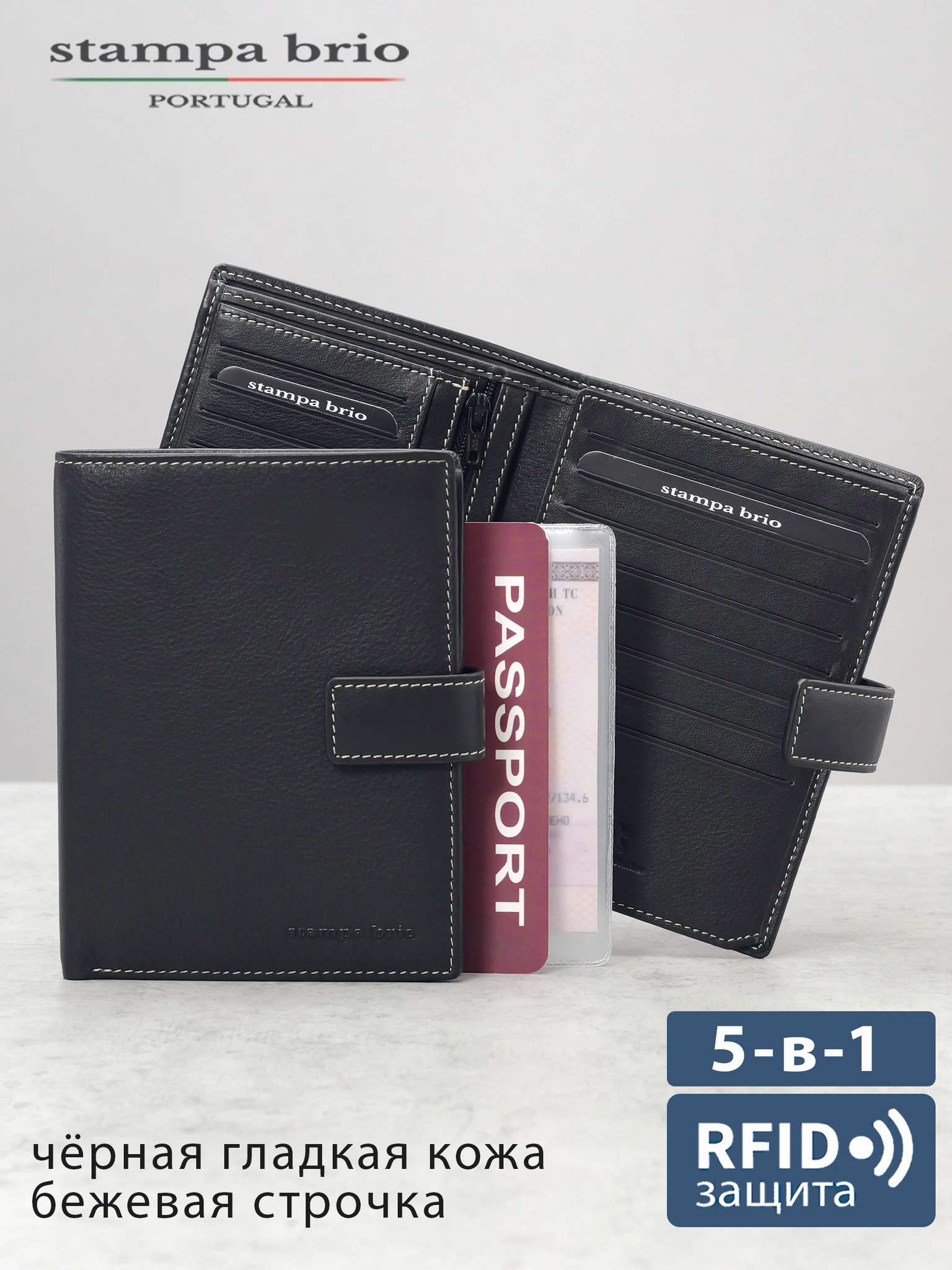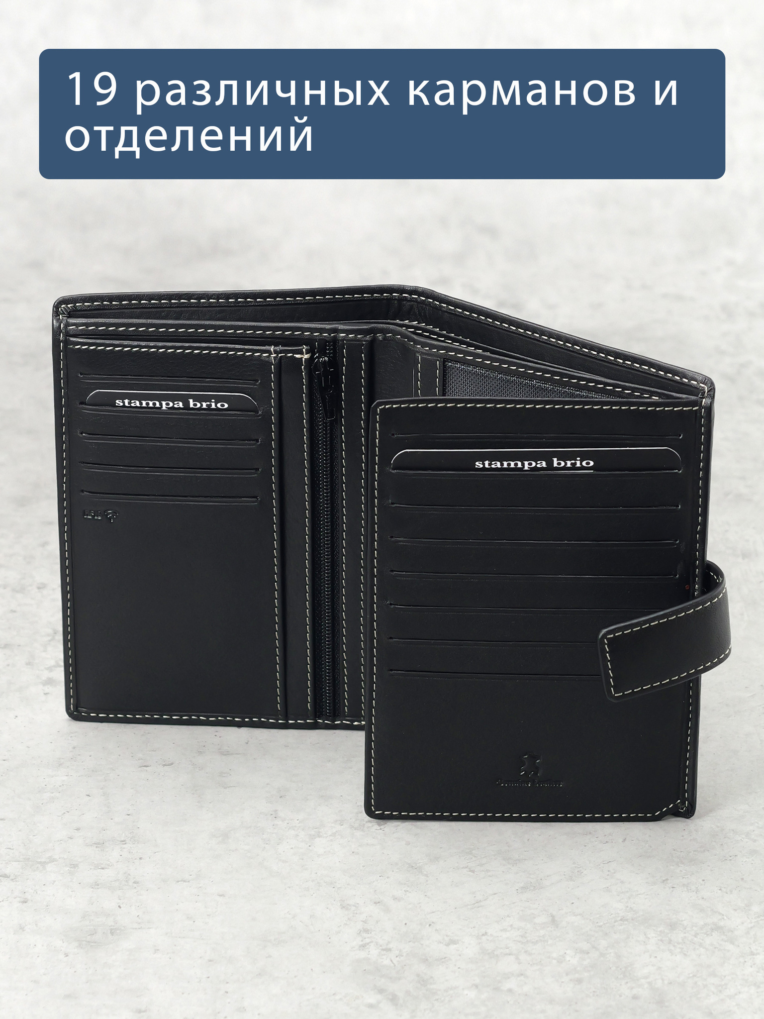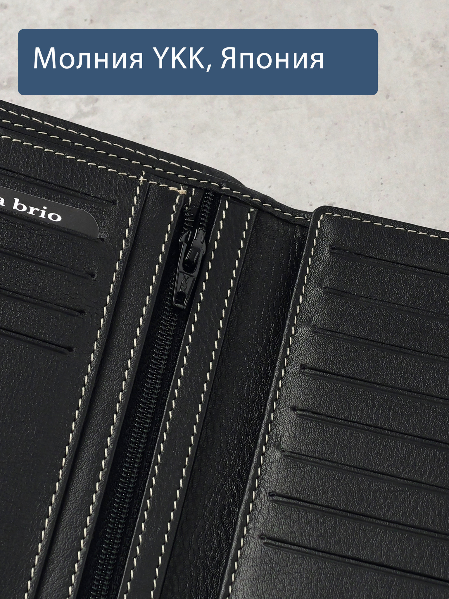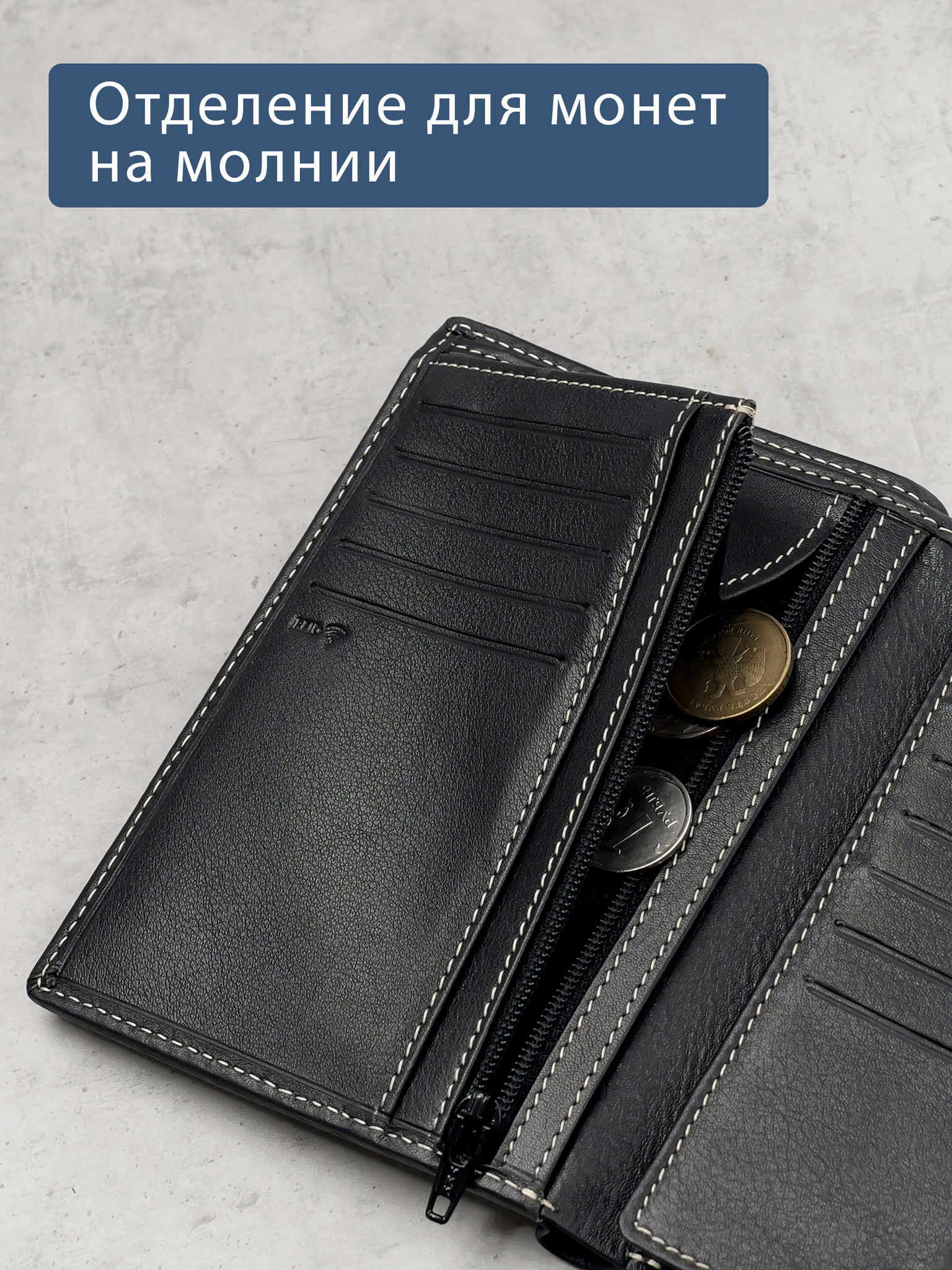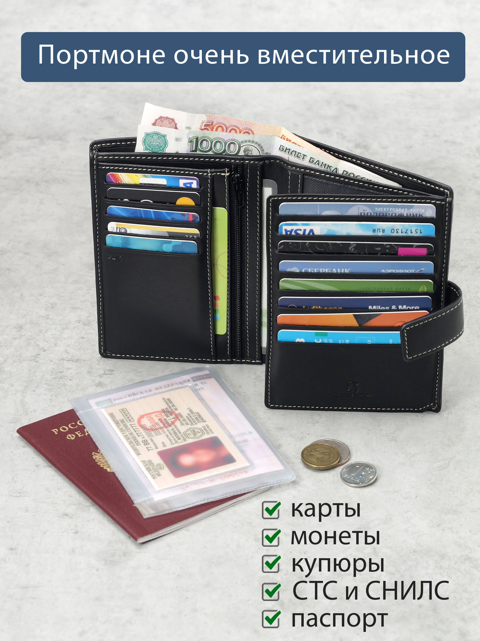 Портмоне вертикальное в одно сложение. 5в1 (купюры, карты, монеты, паспорт, права). С RFID защитой от сканирования. Выполнено из натуральной гладкой кожи черного цвета. Строчка бежевая. Комплектуется облегченным блоком для автодокументов. В карман-сетку можно целиком поместить паспорт. Также внутри имеется два отделения для купюр, 17 карманов для карт и документов, небольшое отделение на молнии. Закрывается на хлястик с кнопкой. Молния от ведущего мирового производителя YKK (Япония), кнопка - PRYM (Германия).