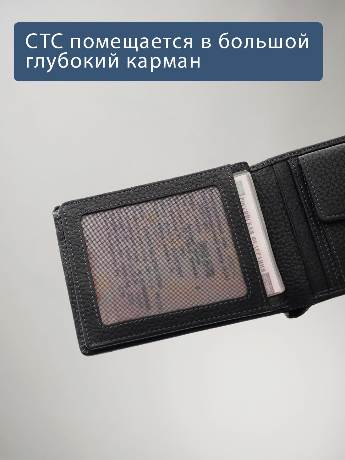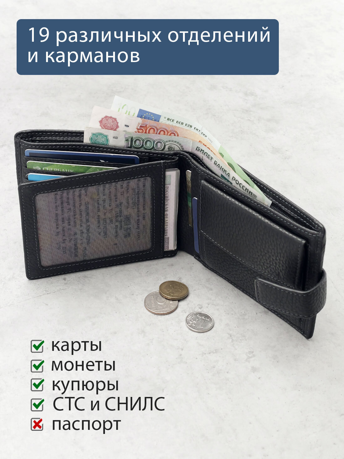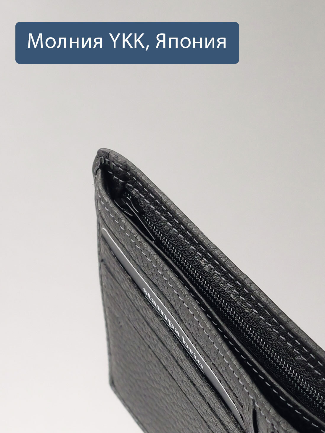 Портмоне горизонтальное с отделением на молнии и RFID защитой от сканирования. Выполнено из натуральной мягкой зернистой кожи черного цвета. Строчка чёрная. Подкладка - жаккард. Внутри два отделения для купюр, отделение на молнии, 8 ячеек для карт, 7 глубоких карманов и монетник на кнопке. Помещается Свидетельство о регистрации транспортного средства. Молния от ведущего мирового производителя YKK (Япония), кнопка - PRYM (Германия)