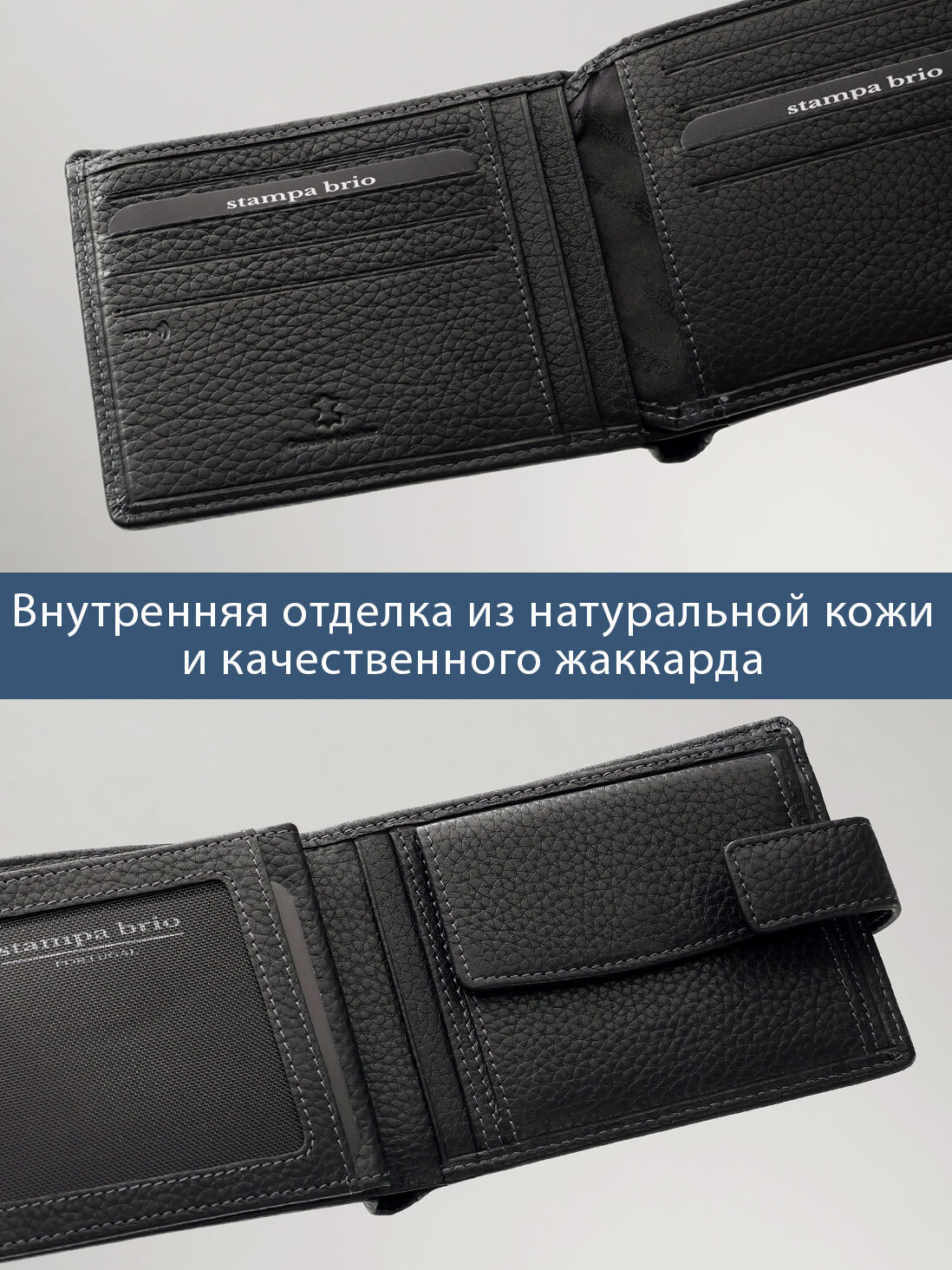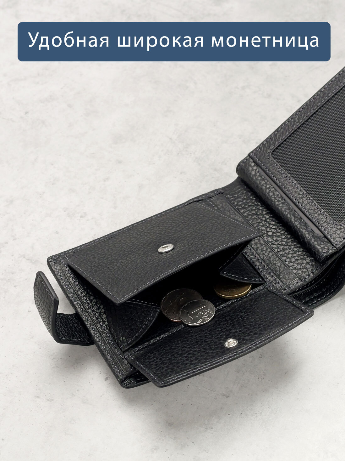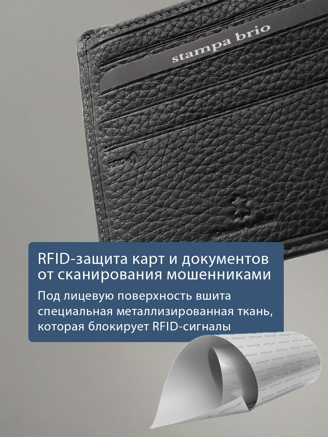Портмоне горизонтальное с отделением на молнии и RFID защитой от сканирования. Выполнено из натуральной мягкой зернистой кожи черного цвета. Строчка чёрная. Подкладка - жаккард. Внутри два отделения для купюр, отделение на молнии, 8 ячеек для карт, 7 глубоких карманов и монетник на кнопке. Помещается Свидетельство о регистрации транспортного средства. Молния от ведущего мирового производителя YKK (Япония), кнопка - PRYM (Германия)
