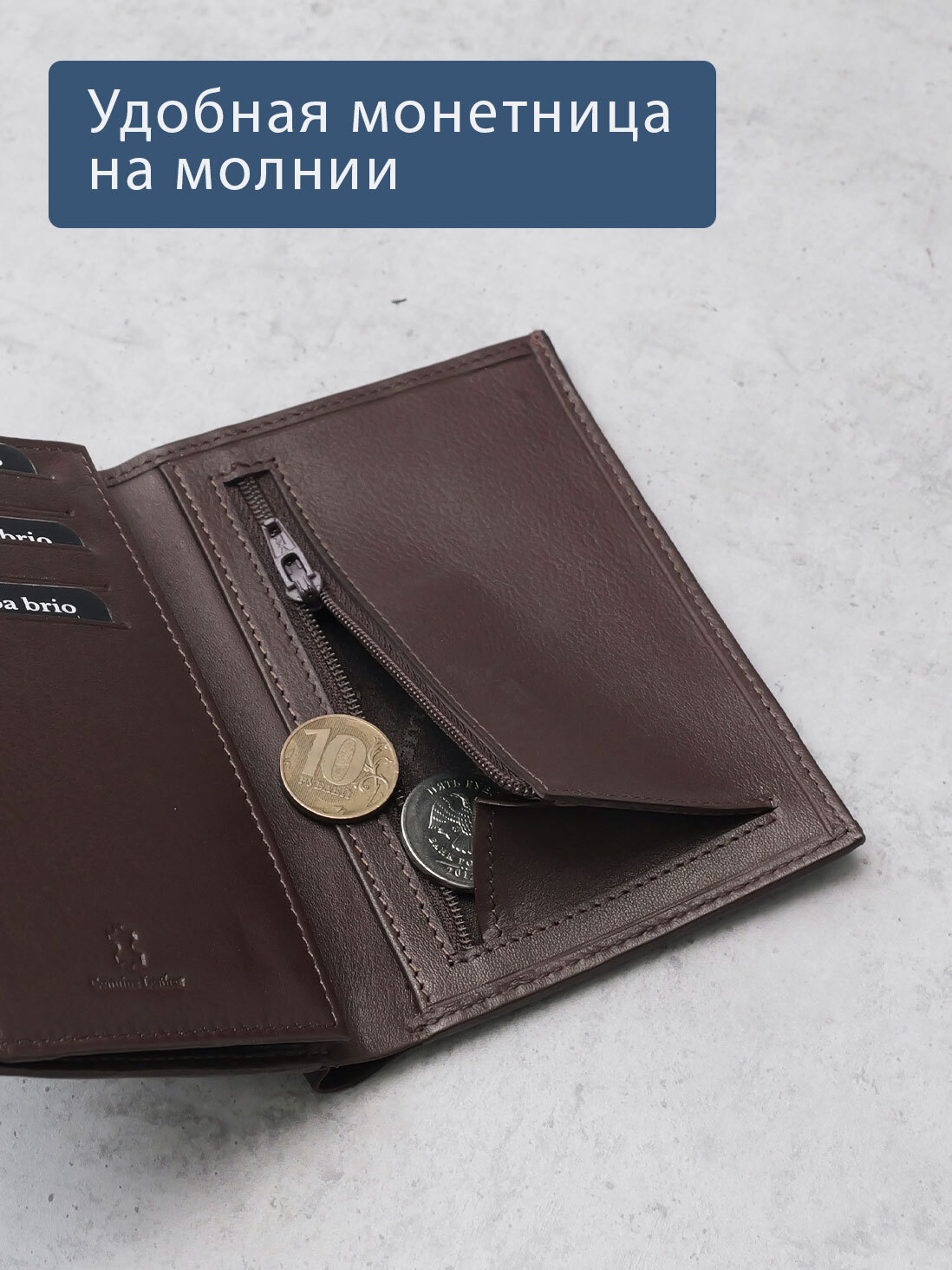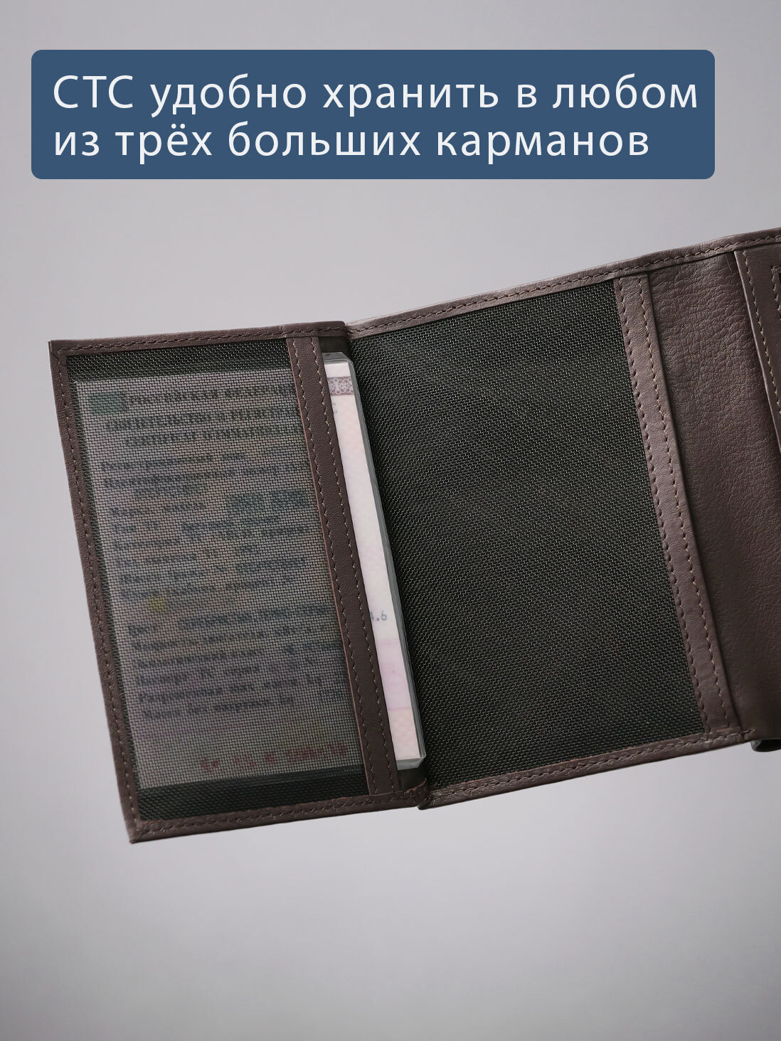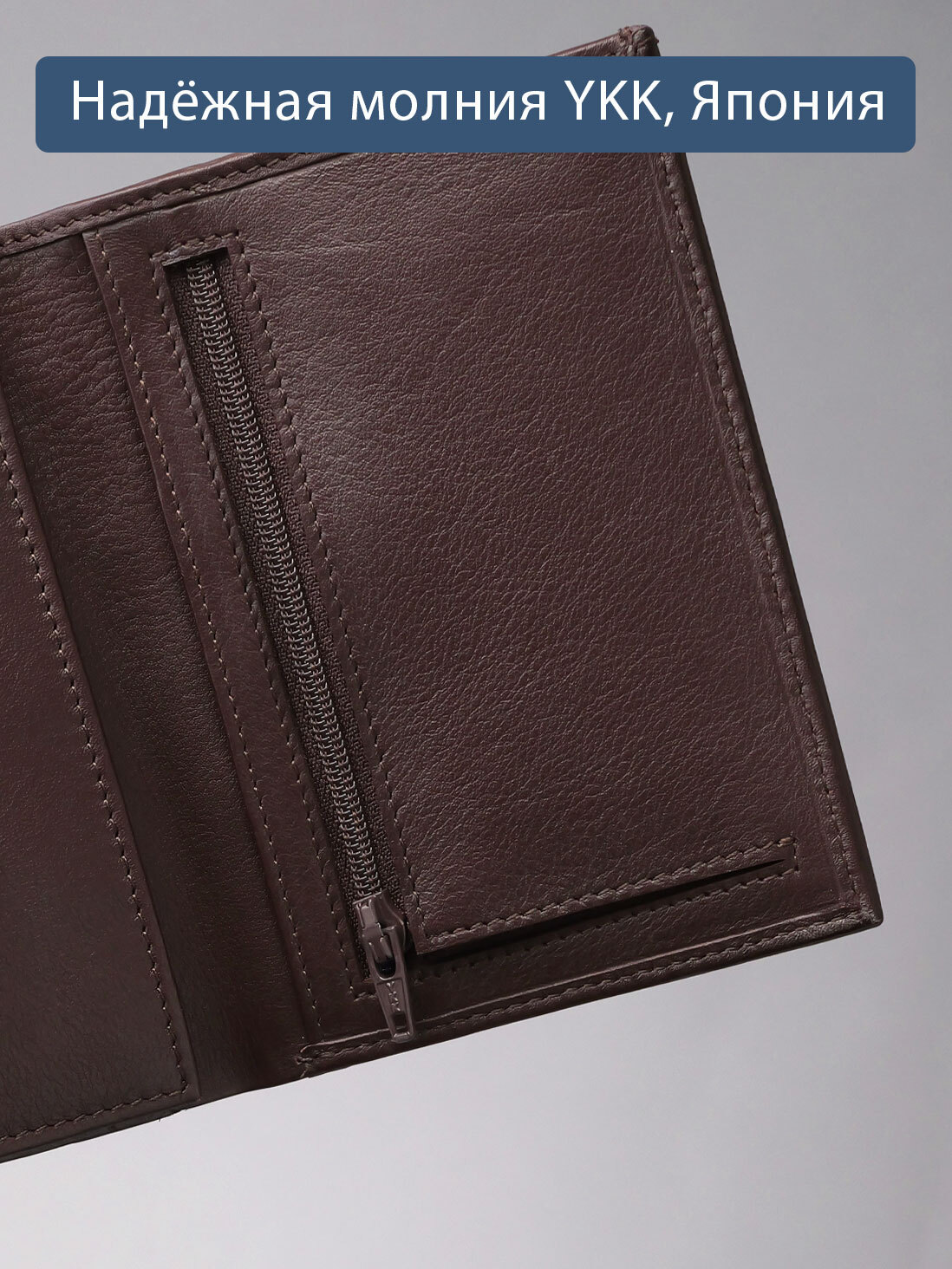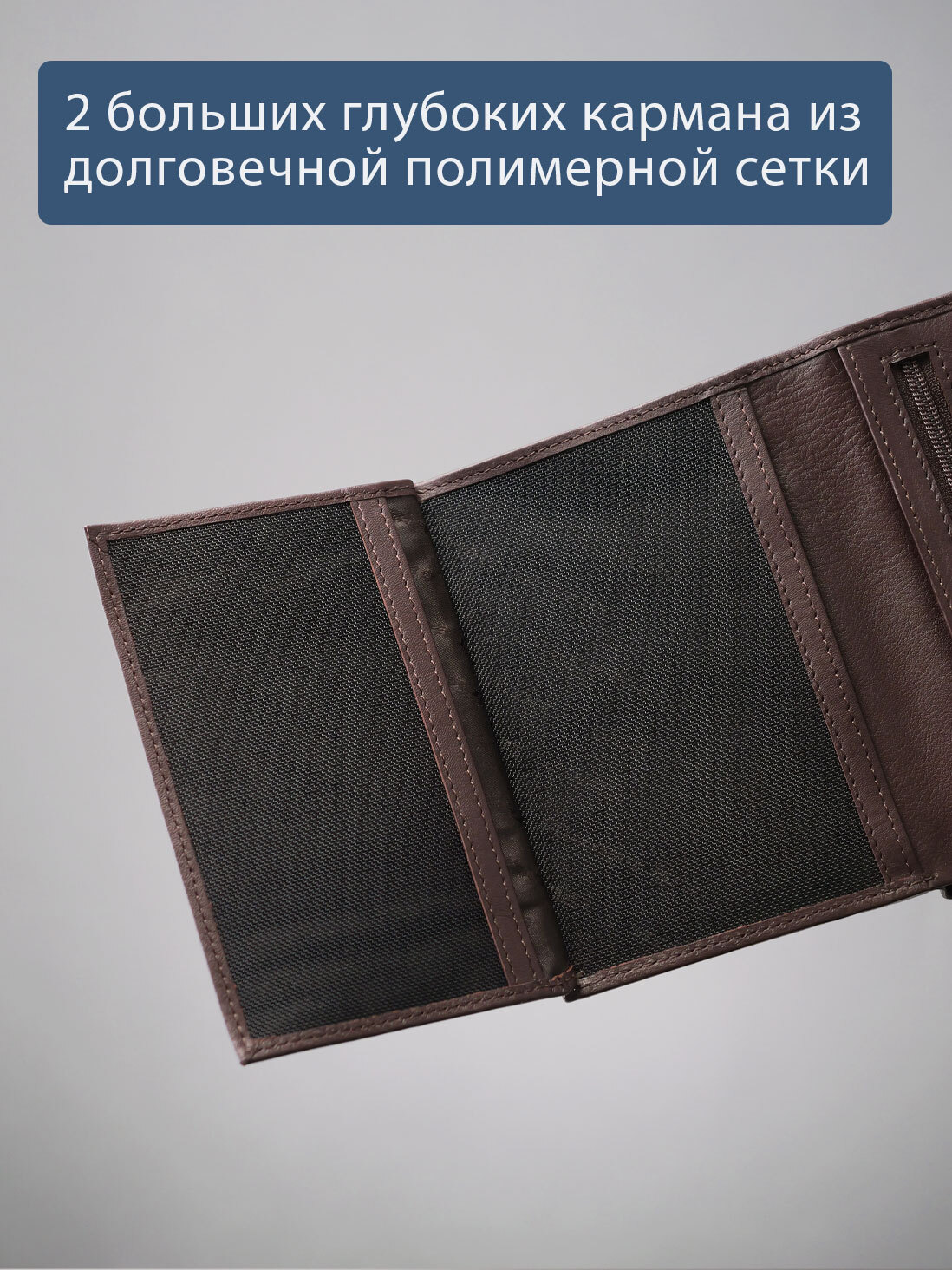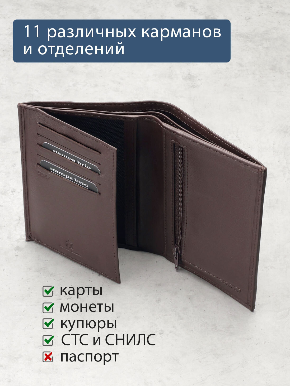 Портмоне вертикальное в одно сложение. С RFID защитой. Выполнено из натуральной гладкой кожи. Подкладка - жаккард. Внутри предусмотрено два отделения для купюр, 5 карманов для карт, отделение для монет на молнии, глубокий карман, 2 больших кармана-сетки, куда можно поместить свидетельство о регистрации транспортного средства. Молния предоставлена ведущей мировой компанией YKK (Япония).