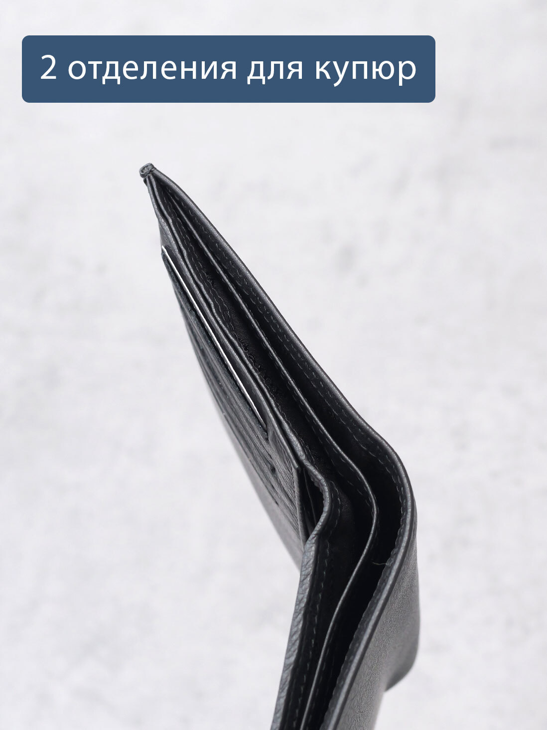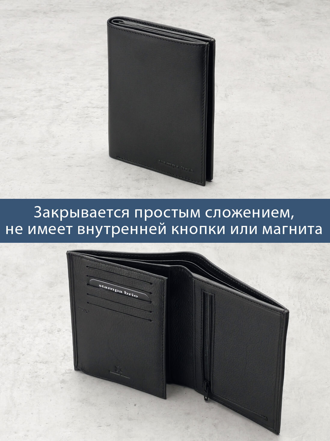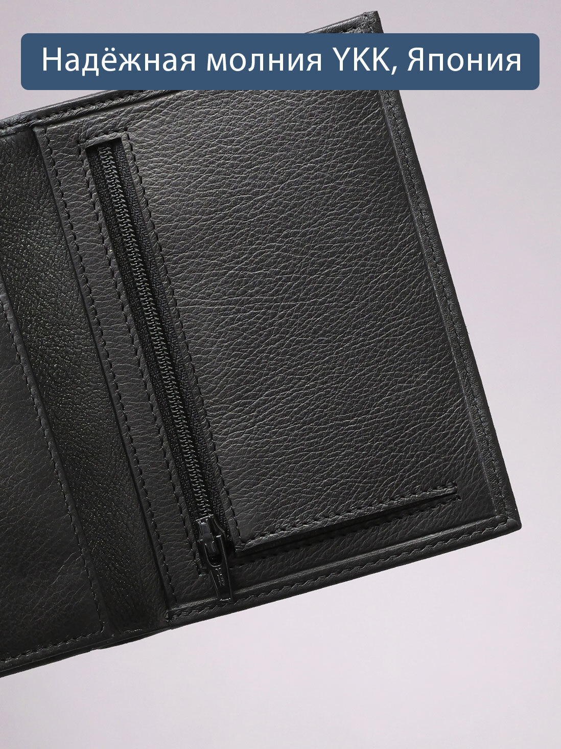 Портмоне вертикальное в одно сложение. С RFID защитой. Выполнено из натуральной гладкой кожи черного цвета. Строчка чёрная. Подкладка - жаккард. Внутри предусмотрено два отделения для купюр, 5 карманов для карт, отделение для монет на молнии, глубокий карман, 2 больших кармана-сетки, куда можно поместить свидетельство о регистрации транспортного средства. Молния предоставлена ведущей мировой компанией YKK (Япония).