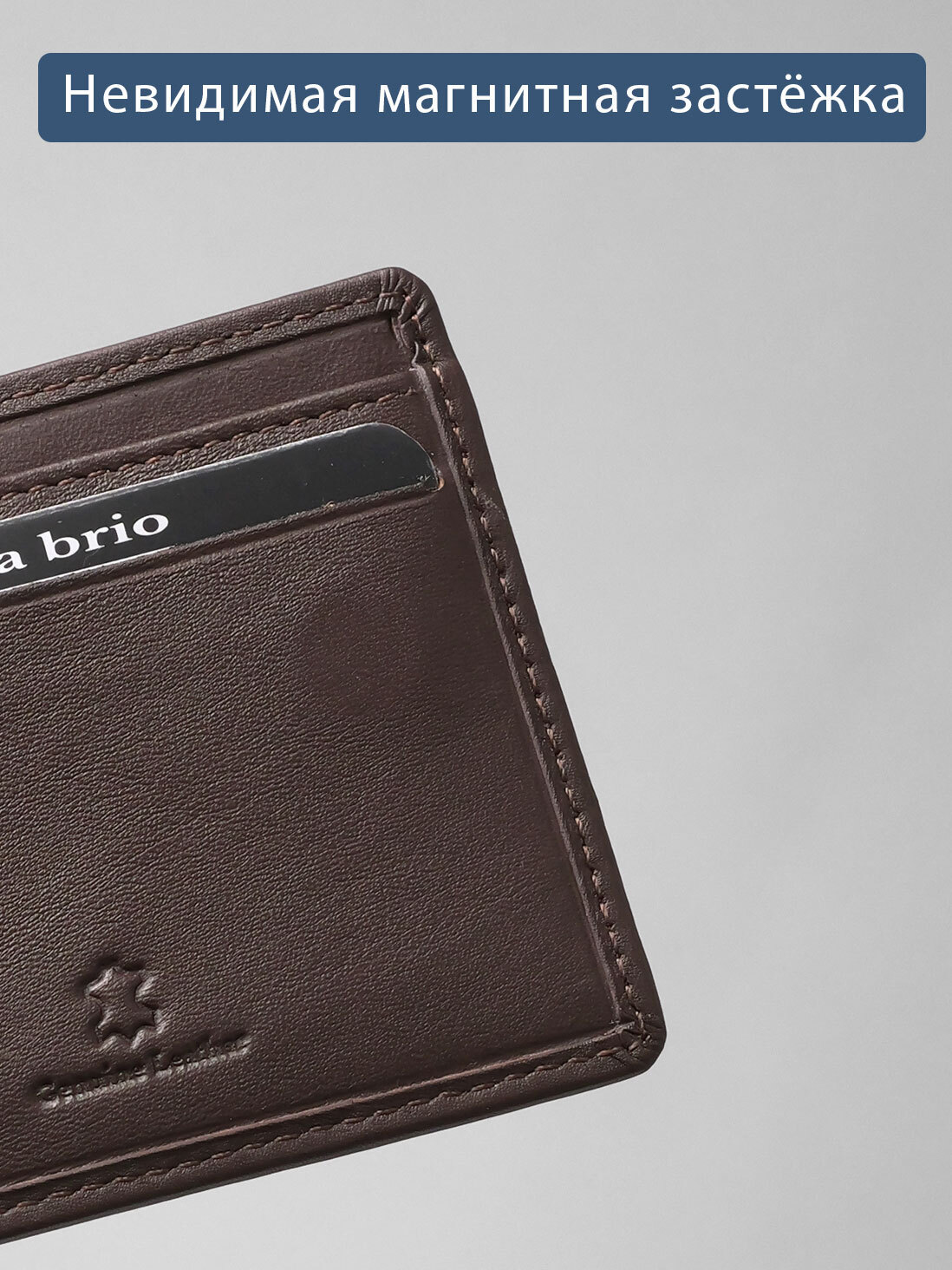 Компактный зажим для купюр на магните. Выполнен из натуральной мягкой кожи тёмно-коричневого цвета. Строчка коричневая. Края изделия декоративно затемнены. Внутренняя отделка - натуральная кожа, подкладка - жаккард. Внутри предусмотрено два кармана для карт и отделение для купюр.