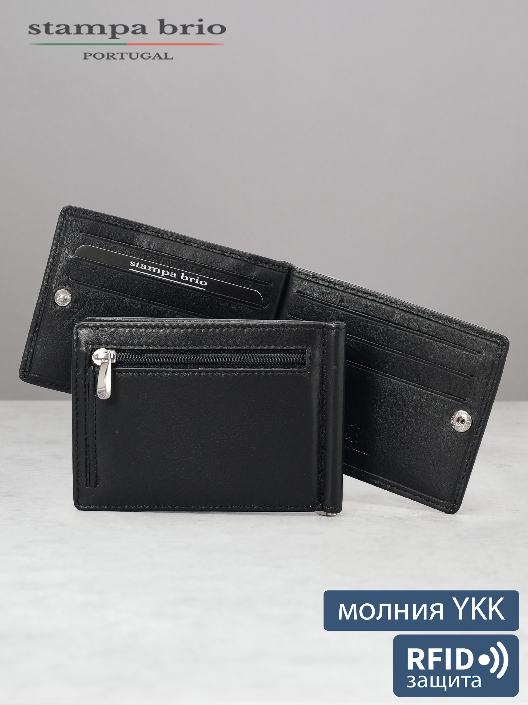 Зажим для купюр выполнен из натуральной мягкой, гладкой кожи Наппа черного цвета. Строчка черная. Внутренняя отделка - натуральная кожа, подкладка - жаккард. Внутри предусмотрено 6 карманов для карт. Снаружи - карман для монет на молнии. Зажим застёгивается на внутреннюю кнопку, что позволяет удерживать его в сложенном состоянии даже при большой наполненности. Дополнительно оснащен защитной системой RFid (от дистанционного считывания карт). Кнопка предоставлена ведущим мировым производителем PRYM (Германия), молния - YKK (Япония).