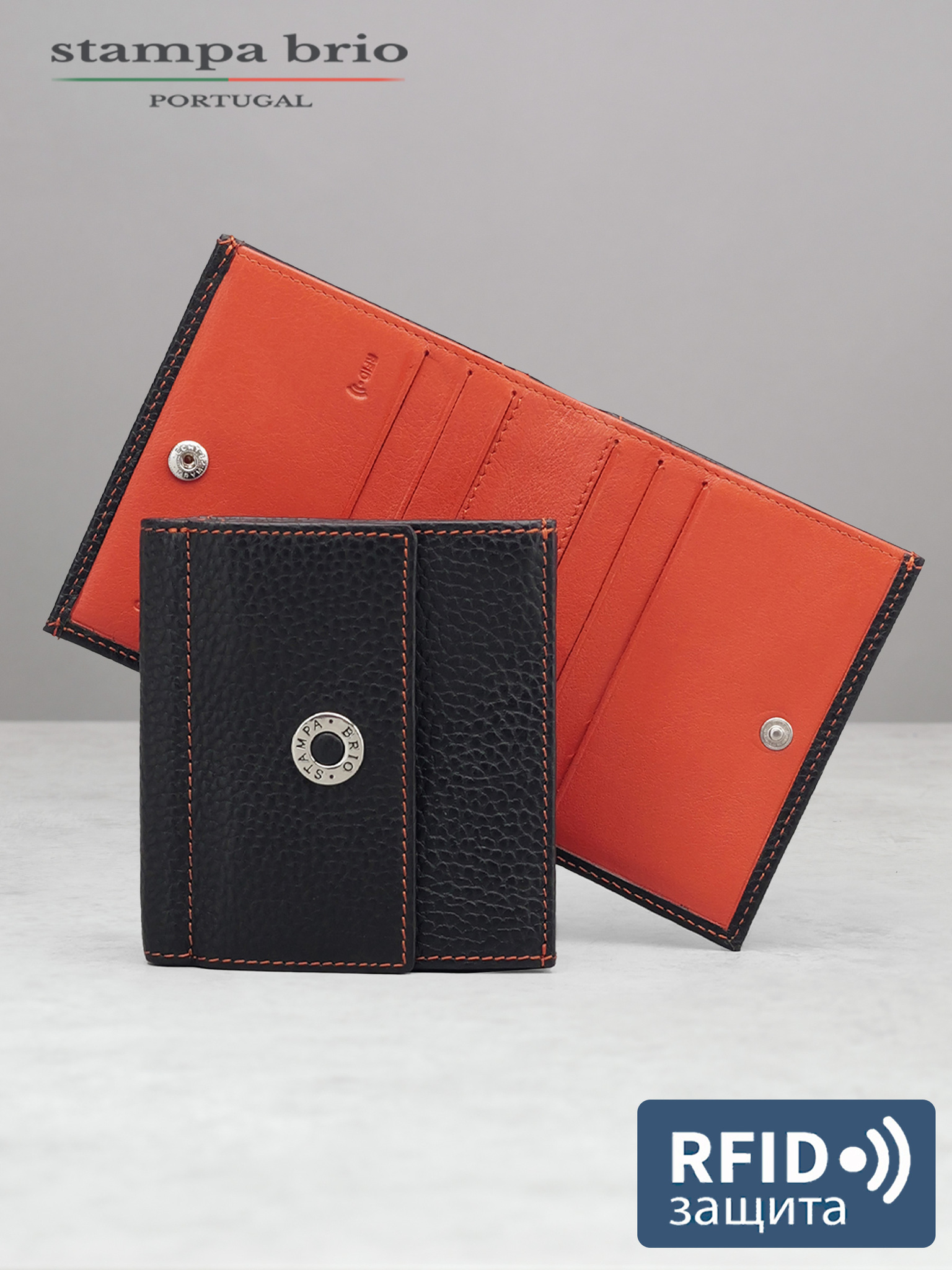 Компактное портмоне в одно сложение. Выполнено из натуральной мягкой кожи черного цвета. Строчка оранжевая. Внутренняя отделка - натуральная гладкая кожа оранжевого цвета. Подкладка - жаккард. Внутри предусмотрено 2 отделения для купюр, 6 карманов для карт. Снаружи - монетник на кнопке. Закрывается на внутреннюю кнопку. Фурнитура от ведущих производителей.: кнопки PRYM (Германия). Дополнительно предусмотрена система защиты RFid (от дистанционного считывания карт).