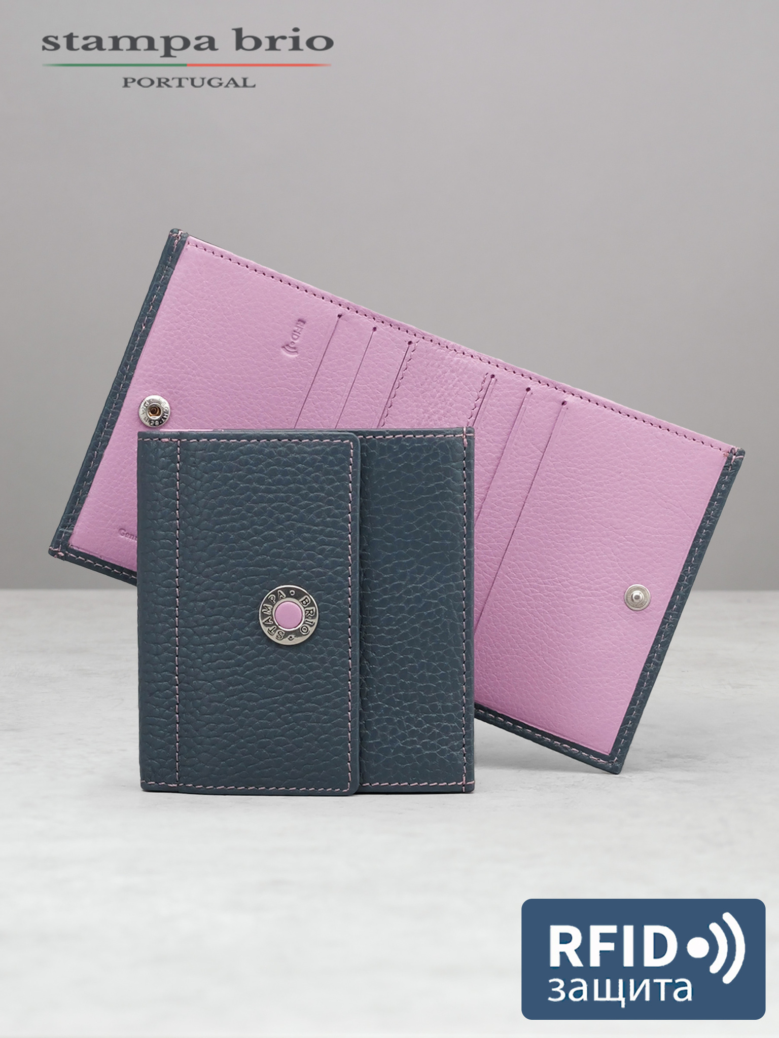 Компактное портмоне в одно сложение. Выполнено из натуральной мягкой кожи синего цвета. Строчка цвета лаванды. Внутренняя отделка - натуральная гладкая кожа цвета лаванды. Подкладка - жаккард. Внутри предусмотрено 2 отделения для купюр, 6 карманов для карт. Снаружи - монетник на кнопке. Закрывается на внутреннюю кнопку. Фурнитура от ведущих производителей: кнопки PRYM (Германия). Дополнительно предусмотрена система защиты RFid (от дистанционного считывания карт).