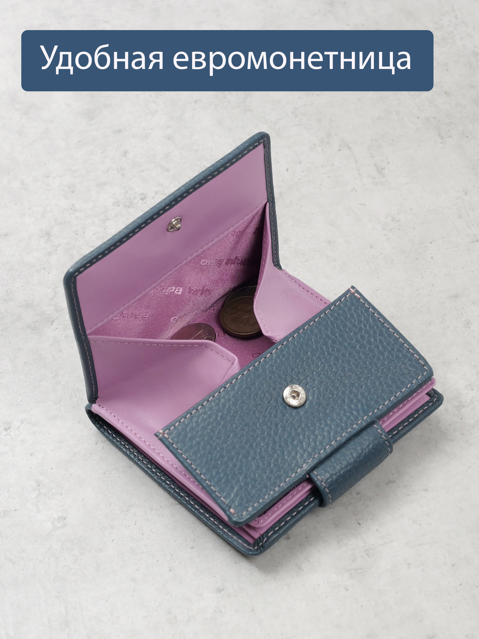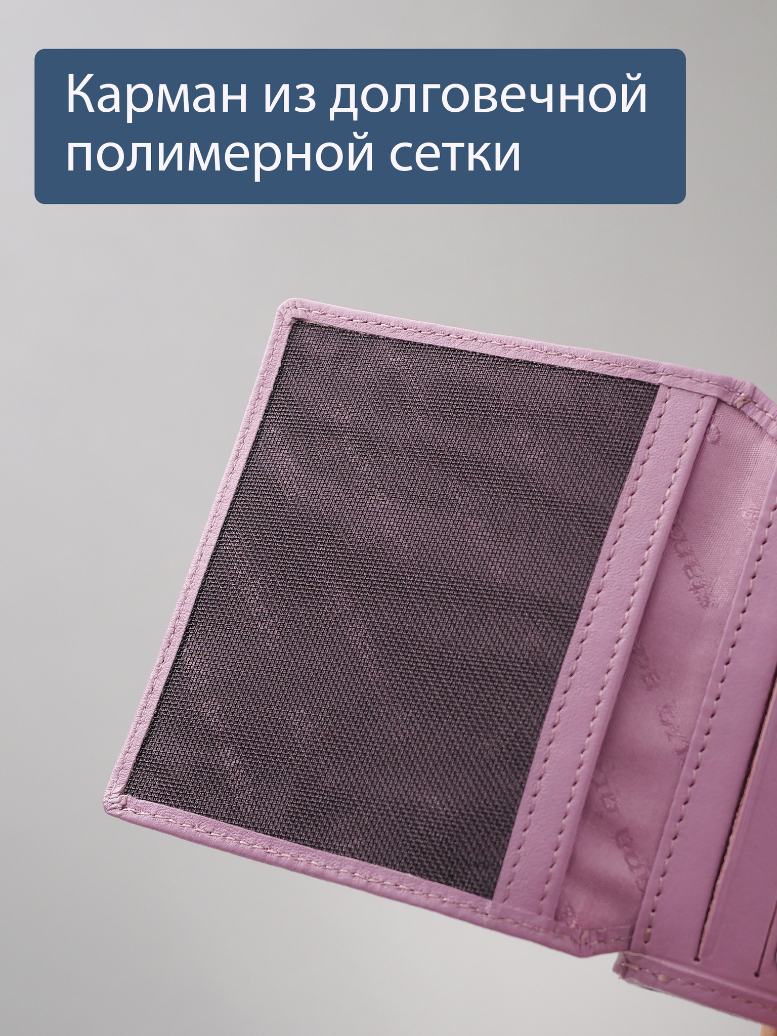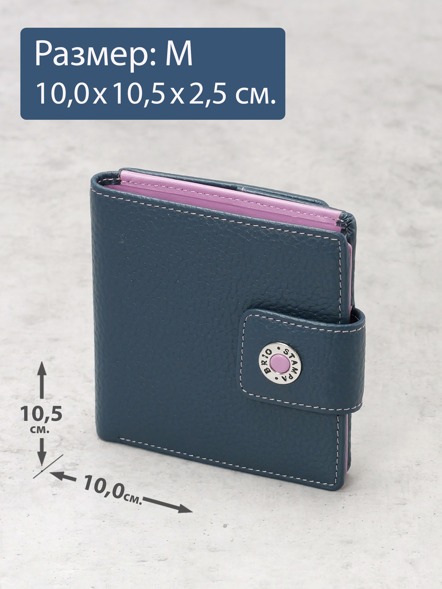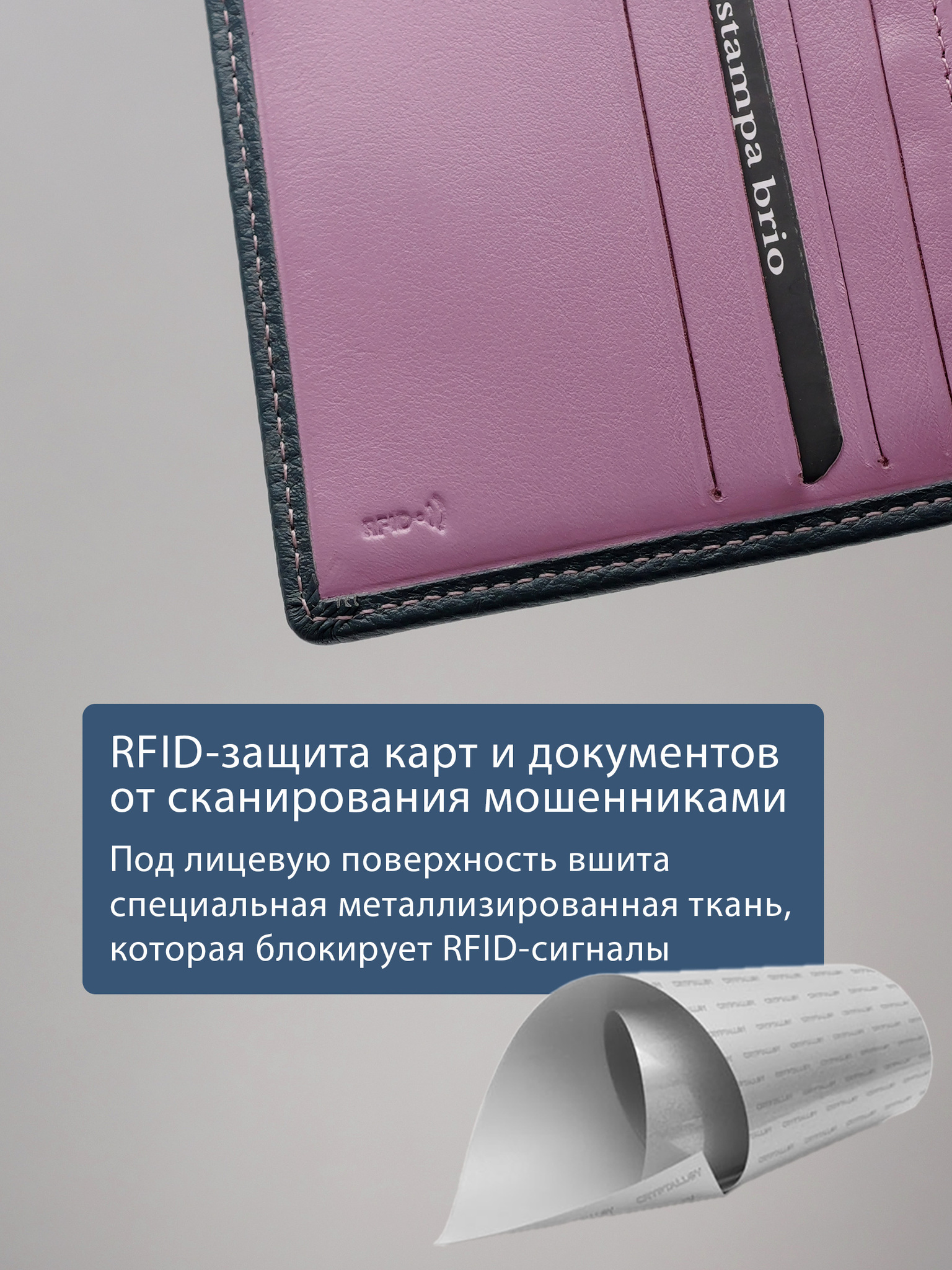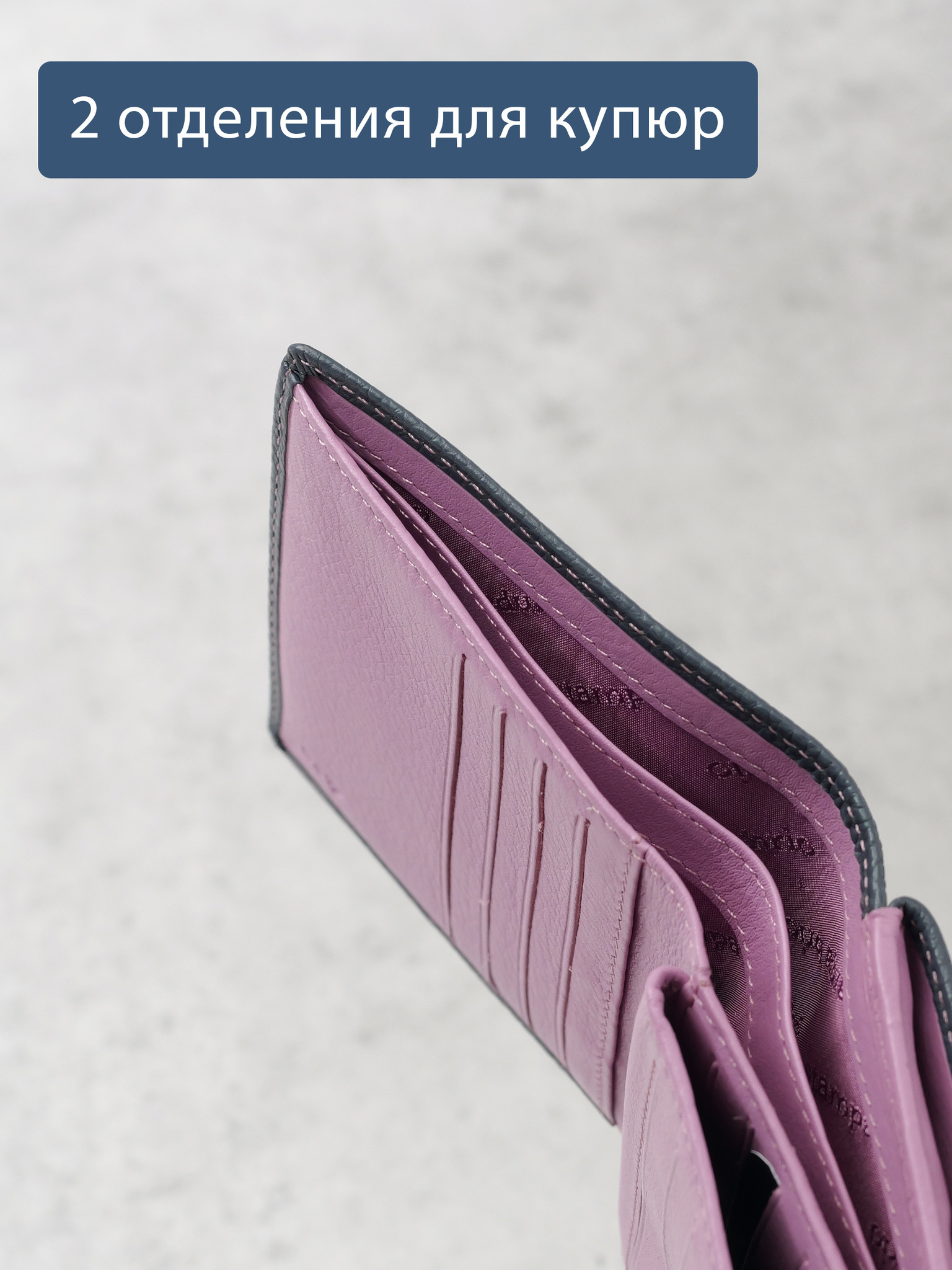 Портмоне в одно сложение. Внутри предусмотрено 2 отделения для купюр, 12 карманов для карт, 2 боковых кармана, 1 карман-сетка. Снаружи - евромонетник на кнопке. Закрывается на застёжку с кнопкой. Кнопки PRYM (Германия). RFID-защита (от дистанционного считывания карт)..