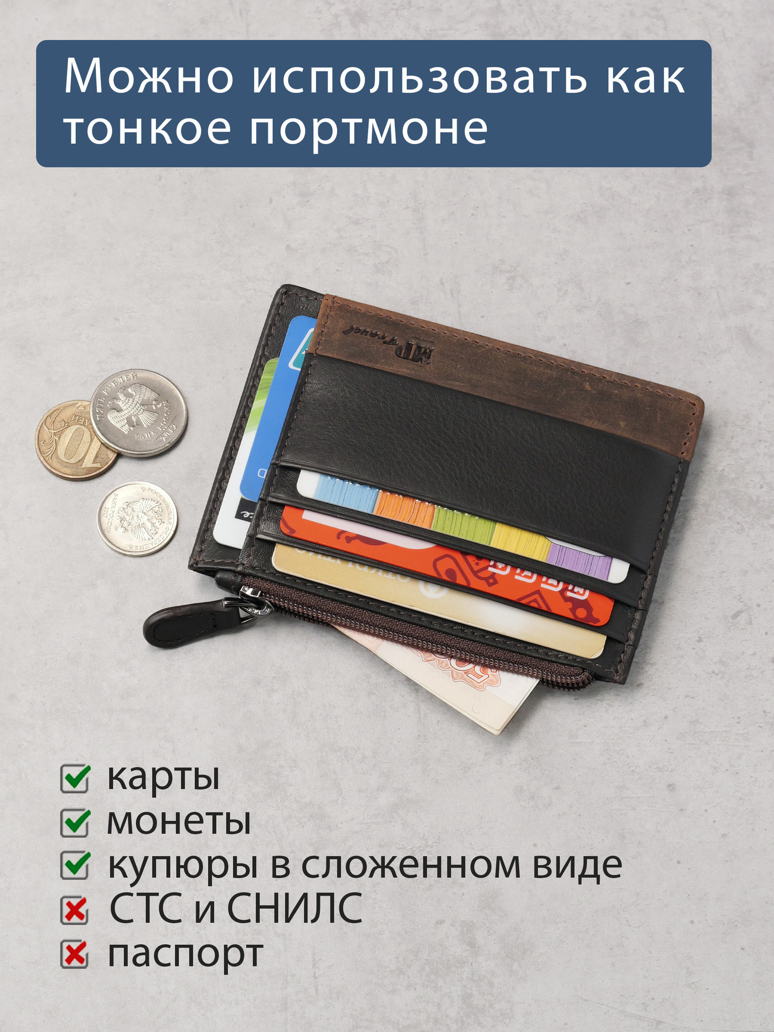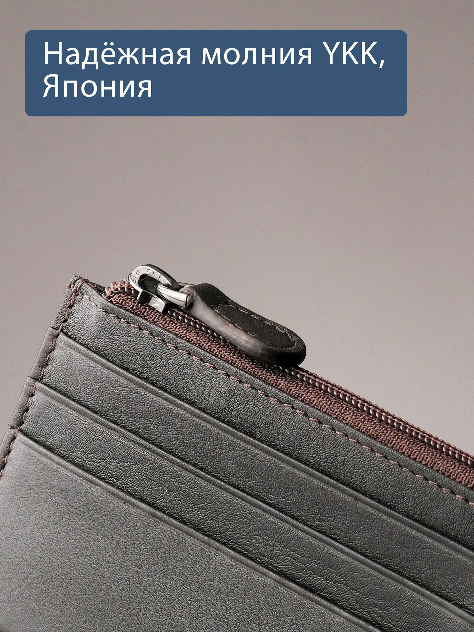 Футляр для карт с RFID защитой из натуральной мягкой кожи Наппа тёмно- коричневого цвета со вставкой из нубука. Предусмотрены 6 карманов для карт, 2 боковых глубоких кармана и один по центру на молнии YKK (Япония).