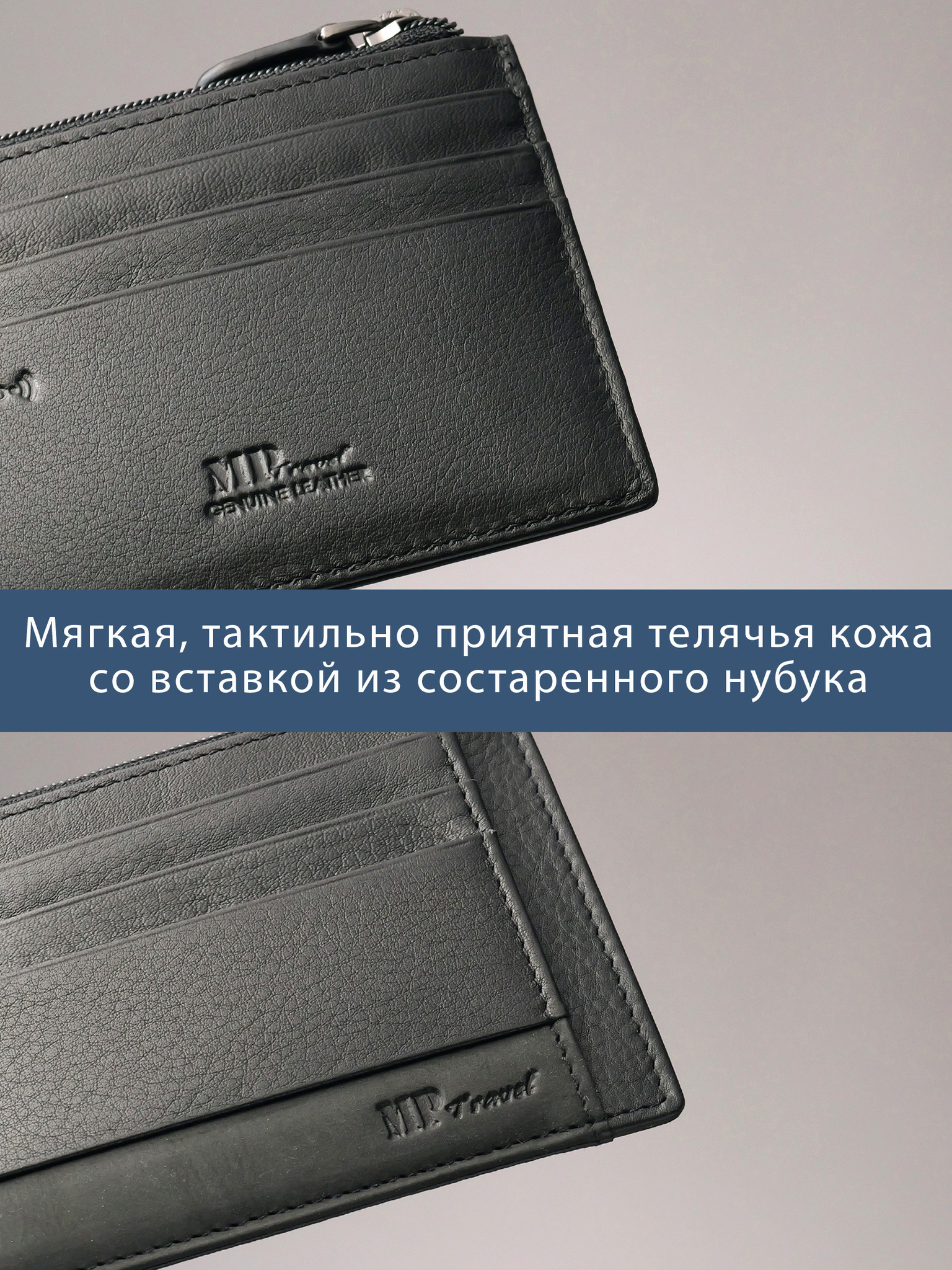 Футляр для карт с RFID защитой из натуральной мягкой кожи Наппа чёрного цвета со вставкой из нубука. Предусмотрены 6 карманов для карт, 2 боковых глубоких кармана и один по центру на молнии YKK (Япония).