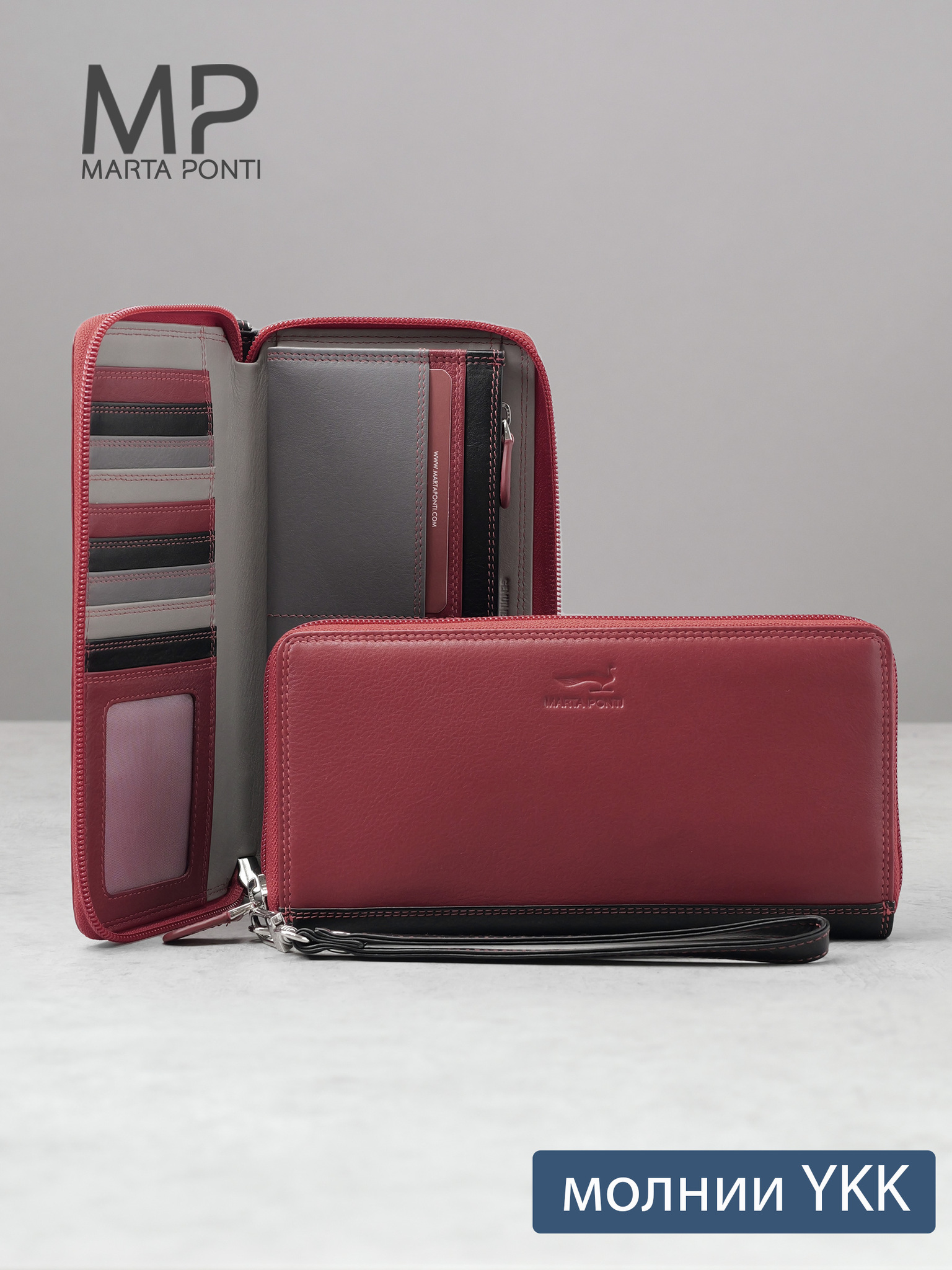 Портмоне выполнено из натуральной мягкой кожи Наппа четырёх цветов: красного, черного, тёмно-серого и серого. Строчка двойная красная. Подкладка - жаккард. Молния от ведущего мирового производителя YKK (Япония). Внутри предусмотрены 2 отделения для купюр, 14 карманов для карт (один из них- прозрачный), отделение для монет на молнии, два больших кармана. Снаружи есть ручка на карабине.